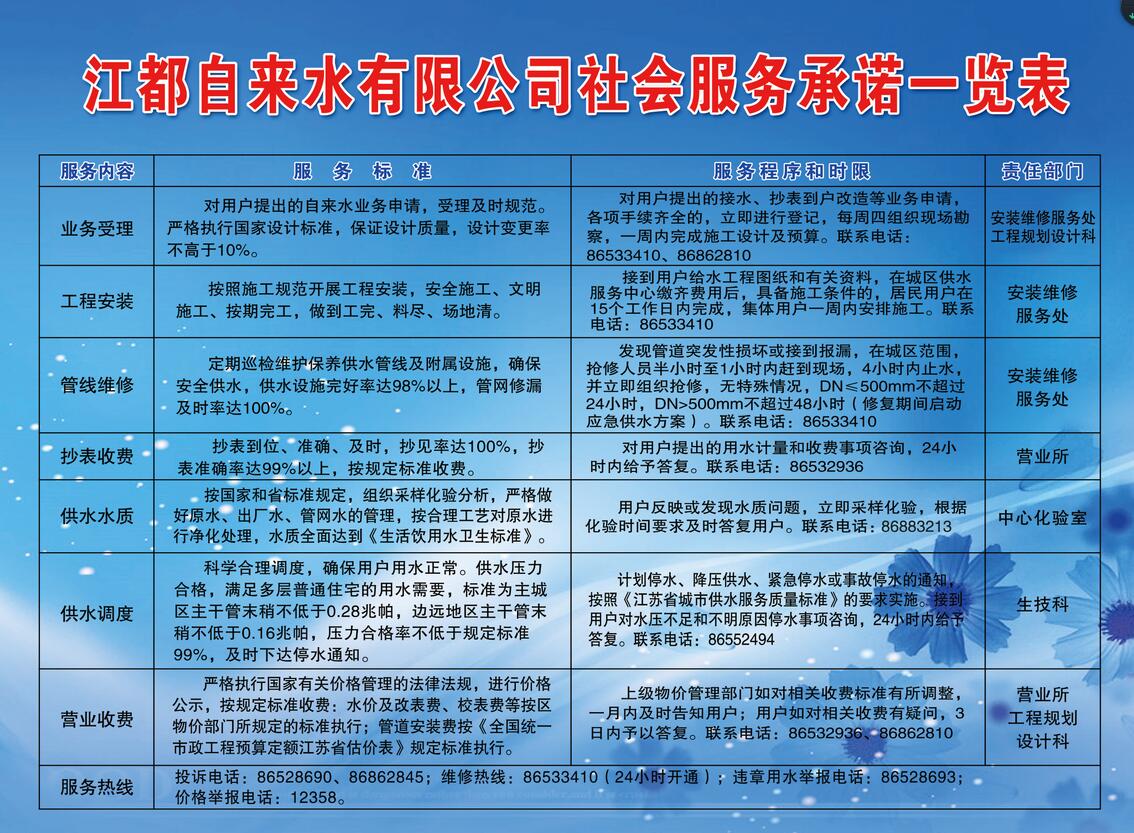 江都自來(lái)水有限公司社會(huì)服務(wù)承諾一覽表